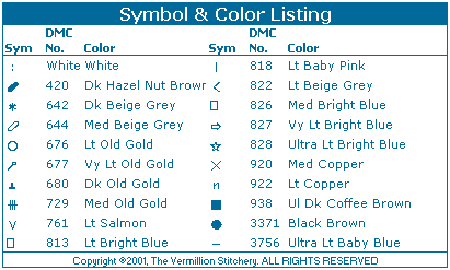 You have our permission to make one photocopy of this chart for your personal (Non-Commercial) use only. This design is not to be re-charted, kitted, sold, modified or redistributed on paper or any other medium without the express written permission from The Vermillion Stitchery.