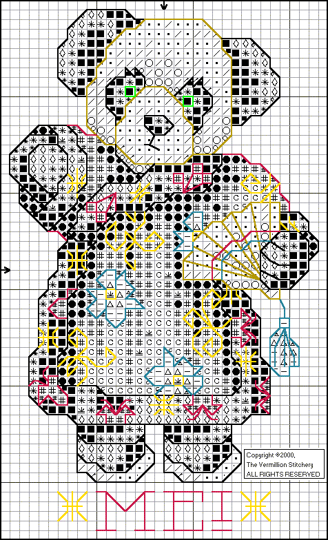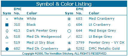 You have our permission to make one photocopy of this chart for your personal use only. This design is not to be re-charted, kitted, sold, modified or redistributed on paper or any other format, including scanning and posting on the internet,  without the express written permission from The Vermillion Stitchery.