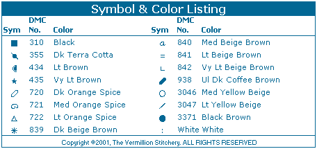 You have our permission to make one photocopy of this chart for your personal (Non-Commercial) use only. This design is not to be re-charted, kitted, sold, modified or redistributed on paper or any other medium without the express written permission from The Vermillion Stitchery.