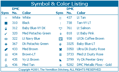 You have our permission to make one photocopy of this chart for your personal (Non-Commercial) use only. This design is not to be re-charted, kitted, sold, modified or redistributed on paper or any other medium without the express written permission from The Vermillion Stitchery.