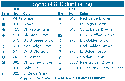 You have our permission to make one photocopy of this chart for your personal (Non-Commercial) use only. This design is not to be re-charted, kitted, sold, modified or redistributed on paper or any other medium without the express written permission from The Vermillion Stitchery.
